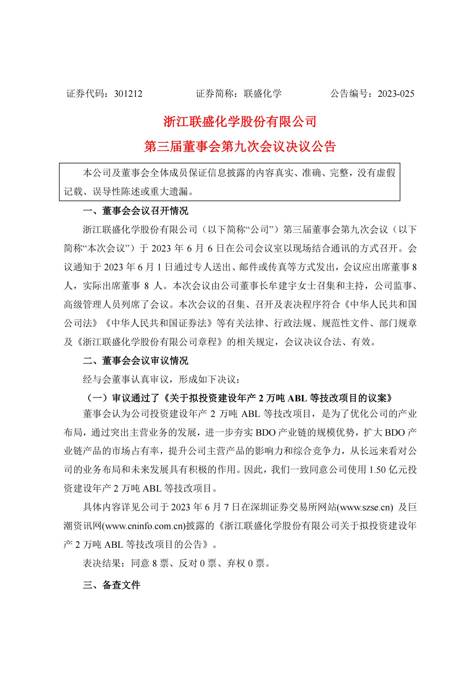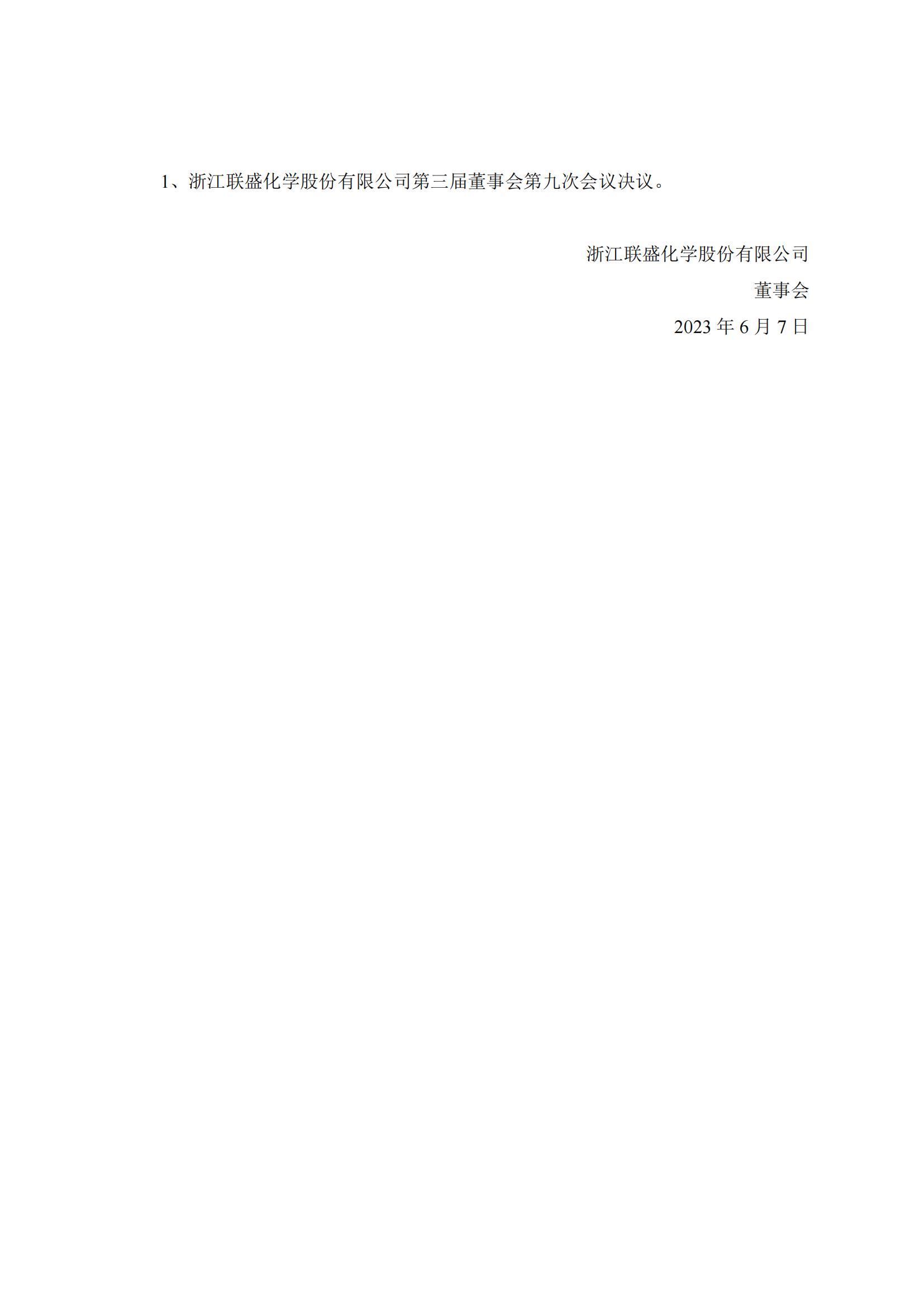浙江聯(lián)盛化學股份有限公司第三屆董事會第九次會議決議公告